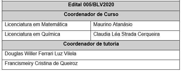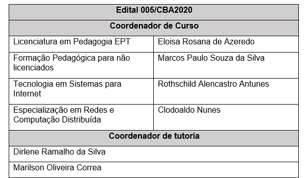 A COORDENAÇÃO GERAL UAB DO INSTITUTO FEDERAL DE EDUCAÇÃO, CIÊNCIA E TECNOLOGIA DE MATO GROSSO, nomeada pela Portaria IFMT nº. 847 de 13.04.2020, no uso de suas atribuições legais e considerando o Resultado Final dos editais nº 005/2020CBA, nº 005/2020BLV e nº 009/2020VGD